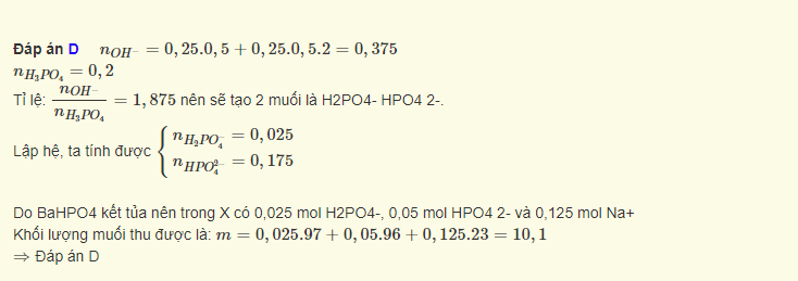 Cho 200 ml dung dịch axit photphoric 1 M tác dụng với 250 ml dung dịch chứa natri hiđroxit 0,5 M và bari hiđroxit 0,5 M. Sau khi phản ứng xảy ra hoàn toàn thu được dung dịch X, cô cạn dung dịch X thì thu được số gam muối khan là