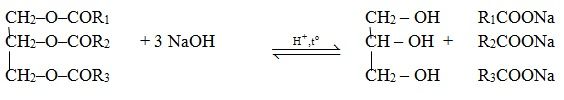 Phản ứng: R1 – OOC – R – COO – R2 + 2NaOH → NaOOC – R – COONa + R1OH + R2OH