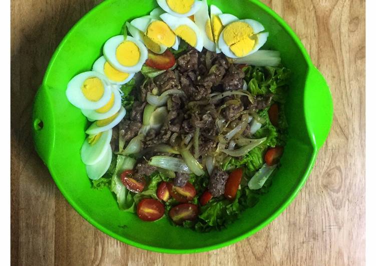 Bước 5: Bày xà lách ra dĩa, xếp cà chua bi lên, rưới nước mắm chanh và cho hết phần thịt bò vừa tao vào, dùng dụng cụ để cắt trứng xếp lên trên và thưởng thức. (nếu ai ăn béo có thể sử dụng thêm Myonnaise)