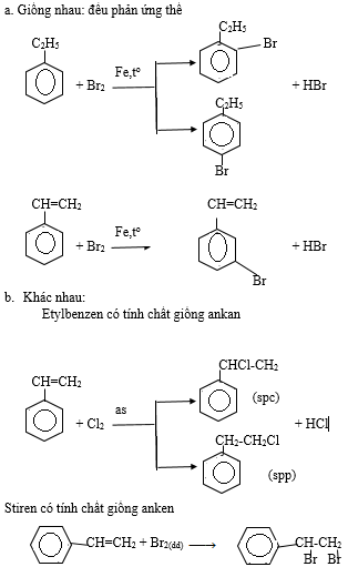 So sánh tính chất hóa học của etylbenzen với stiren